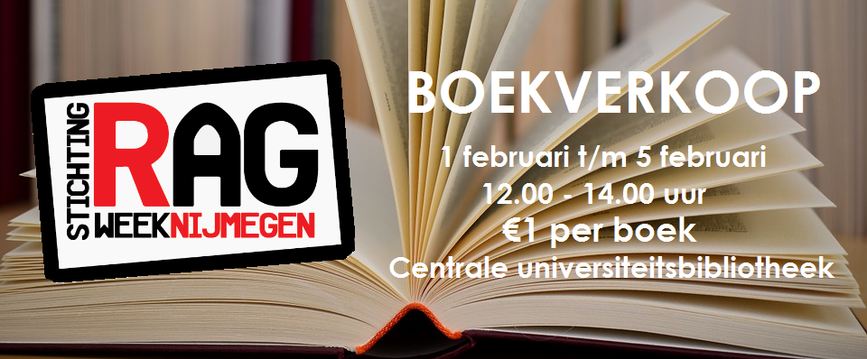 Van 1 tot en met 5 februari zal er een boekverkoop voor de goede doelen van de RAGweek gehouden worden. De boekverkoop zal plaatsvinden in de Centrale Universiteitsbibliotheek. Boeken worden verkocht voor een zacht prijsje en de opbrengst zal geschonken worden aan de RAGweek. Kom snel een kijkje nemen of dat ene pareltje waar je al zo lang naar zoekt erbij ligt!