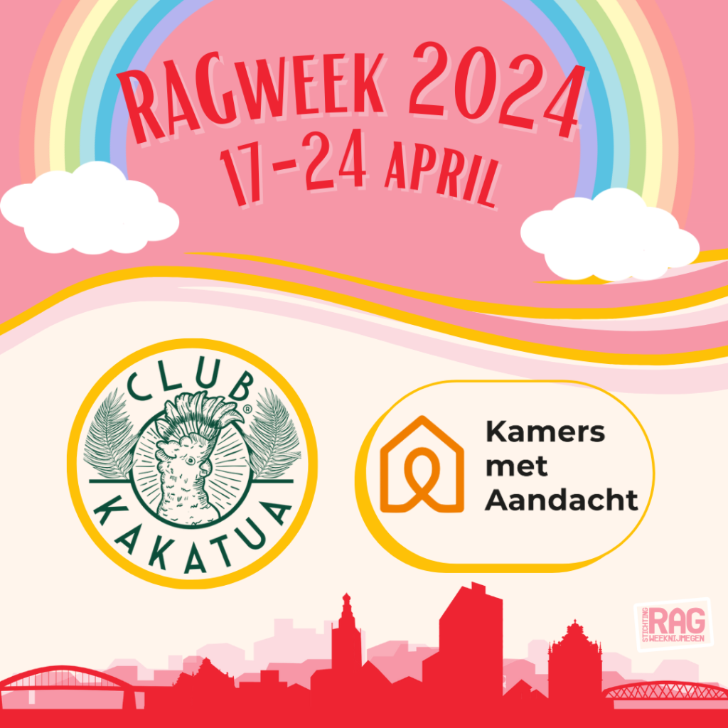 De RAGweek zal aankomend jaar plaats gaan vinden van woensdag 17 april tot en met woensdag 24 april 2024. Deze week zullen allerlei leuke activiteiten worden georganiseerd voor en door studerend Nijmegen, dus zet het in je agenda! Dit jaar steunen wij Kamers met Aandacht en Club Kakatua, hieronder lees je meer over onze goede doelen!